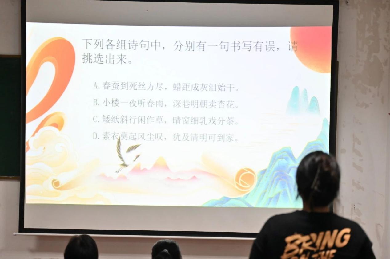 比赛进入最后环节——经典古诗词默写。在本环节中,参赛队伍派任意成员登场,3分钟内精准默写指定诗词,错一字扣一分,细节定成败!这是对参赛选手们诗词记忆的终极检验,也让选手们 “笔下生诗” 的功底,成为影响比赛胜负的关键。